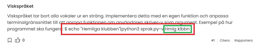 Viskspråket tar bort alla vokaler ur en sträng. Implementera detta med en egen funktion och anpassa terminalgränssnittet till att anropa funktionen om användaren skriver-v som argument. Exempel på hur programmet ska fungera: $ echo "Hemliga klubben"|python3 sprak.py-v Hmlg klbbn