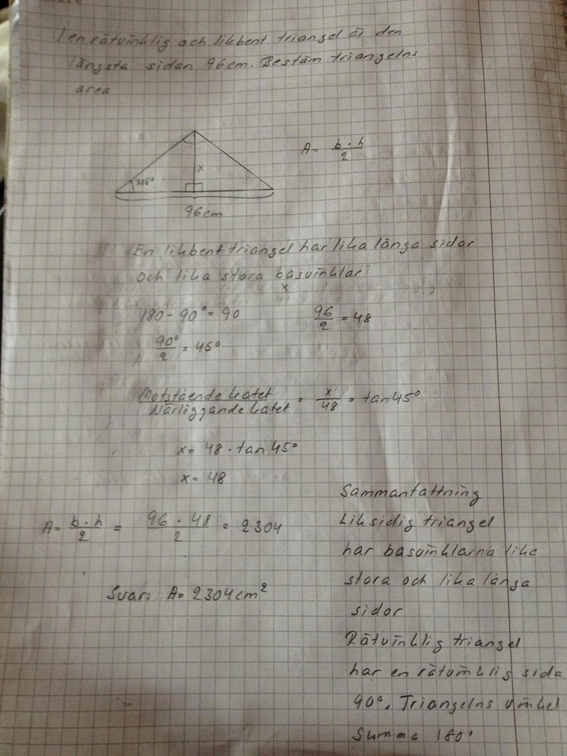 Du menar väl "i en likbent rätvinklig triangel"?! För annars stämmer det inte.