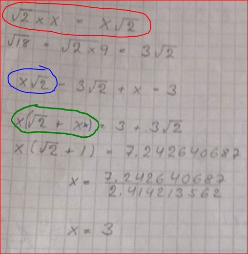 Här verkar läraren ha gjort ett misstag och inte dragit ut rottecknet över hela uttrycket (rödmarkerat). Annars stämmer det inte att ekvationen har lösningen x = 3.
