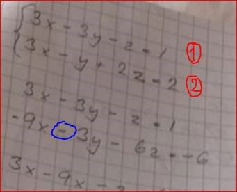 Jag hittar ett slarvfel när du multiplicerar ekvation 2 med -3, du glömmer då att byta tecken på andra termen (blåmarkerad).
