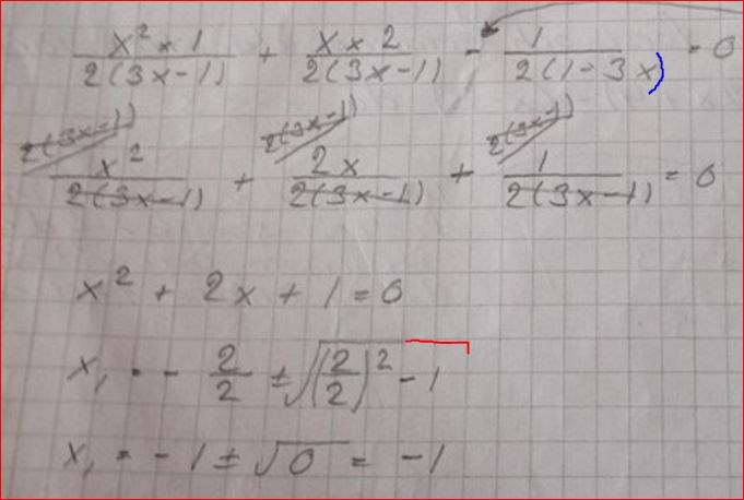 Rödmarkerat: Är x under rottecknet (som inte heller det når ända ut) ett x eller en multiplikationssymbol? Jag antar att det är ett x för annars stämmer inte likheten och då inte heller det blåmarkerade.