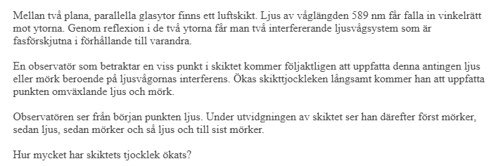 Hej, se fråga nedan. Jag har vet inte riktigt hur jag ska visualisera eller rita upp denna uppgift. Jag förstår att jag har två plana och parallella glasytor med ett skikt emellan, och ljus kommer in o studsar runt i skiktet. Skulle någon kunna rita upp och förklara hur det ser ut på ett lite enklare sätt? Hur åker ljuset i skiktet, vart ligger en sådan punkt som betraktas, etc. OBS: jag vill inte ha hjälp med något mer än att bara visualisera det.