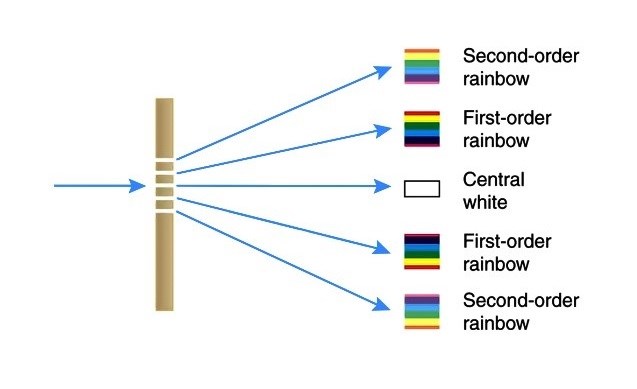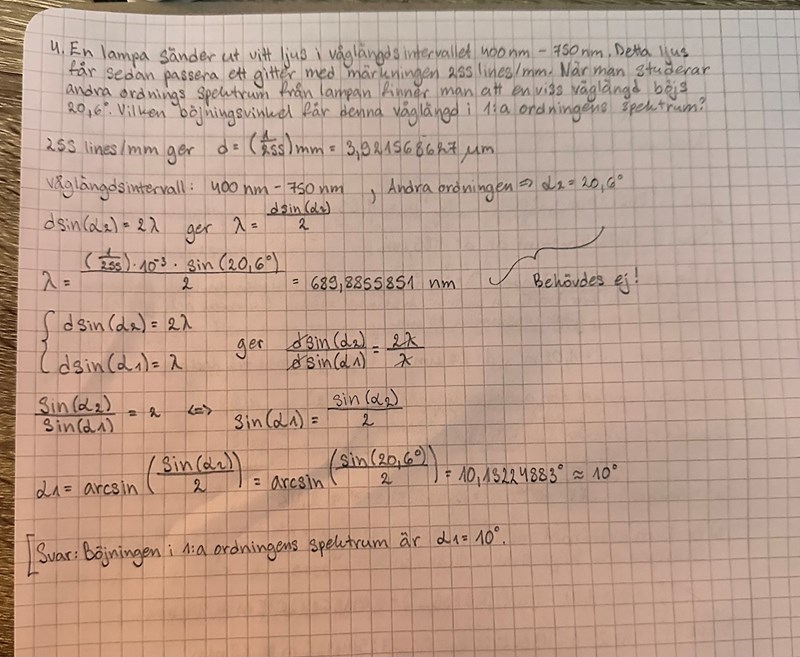 En lampa sänder ut vitt ljus i våglängdsintervallet 400 nm - 750 nm. Detta ljus får sedan passera ett gitter med märkningen 255 lines/mm, se nedan. När man studerar andra ordnings spektrum från lampan finner man att en viss våglängd böjs 20.6 °.