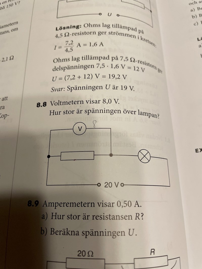 Spänningen över resistorn är 8 V. Spänningen över lampan är ... och sammanlagt r det 20 V.