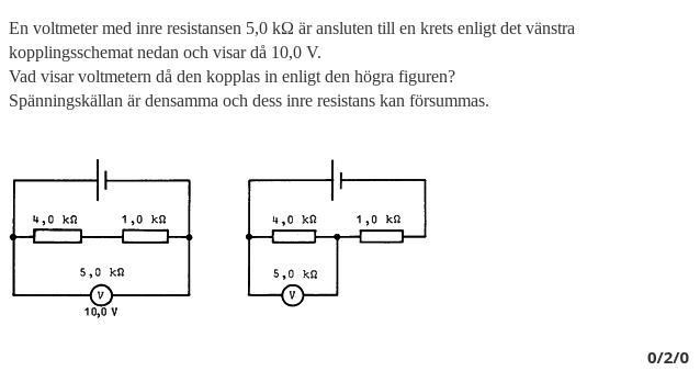 Jag har försökt lösa genom att se att i krets 1 är voltmetern 10 V, så eftersom det är paralellkoppling är alltså hela spänningen i kretsen 10 V. Totala resistansen är 1/5000+1/5000= 1/2500, dvs 2500 ohm. Strömmen är 10/2500= 0,004 A