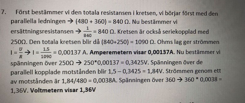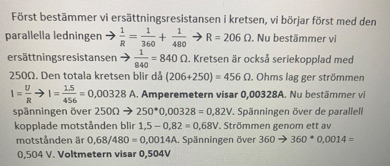 Smaragdalena skrev:Du har räknat ut vad voltmetern skulle ha visat om den var inkopplad parallellt med 360Ω-motståndet, men på bilden är voltmetern inkopplad parallellt med 250Ω-motståndet.
