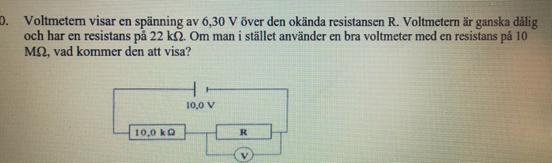 Beräkna först ersättningsresistansen för R (75kΩ) och voltmetern (10MΩ) som ligger parallellkopplade. Beräkna sedan hur spänningen 10V fördelar sig över motståndet på 10k och den ersättningsresistans du beräknat. Du bör se att voltmetern nu visar ett betydligt högre värde än 6,3V.