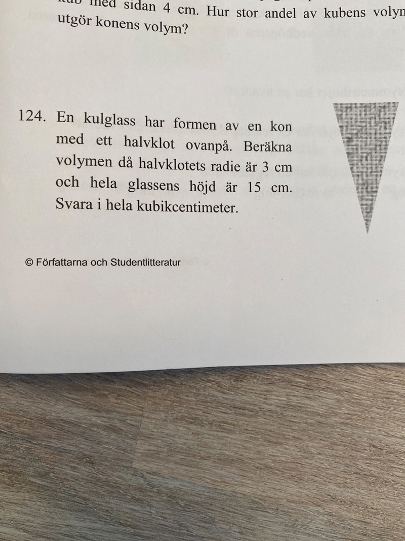 Om jag delar 113.04 i hälften ( eftersom det är ett halvklot ) så får jag svaret 56.52. Men svaret ska bli totalt 170 kubikcentimeter.