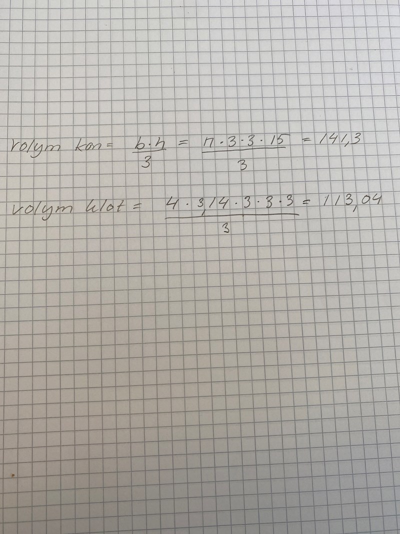 Nu måste du räkna ut en ny volym på konen som alltså är 15-3 hög och har radien 3 i toppen