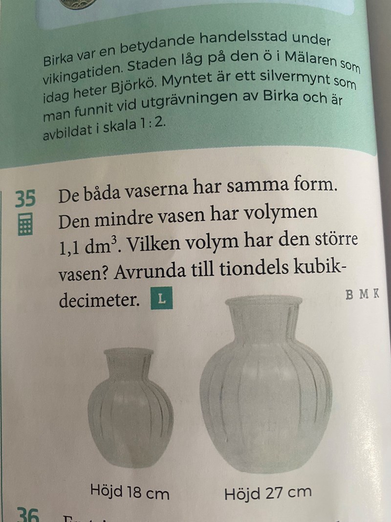Om vi antar att den lilla vasen är "verkligheten", vad skall man multiplicera höjden med för att få rätt värde för den stora vasen?