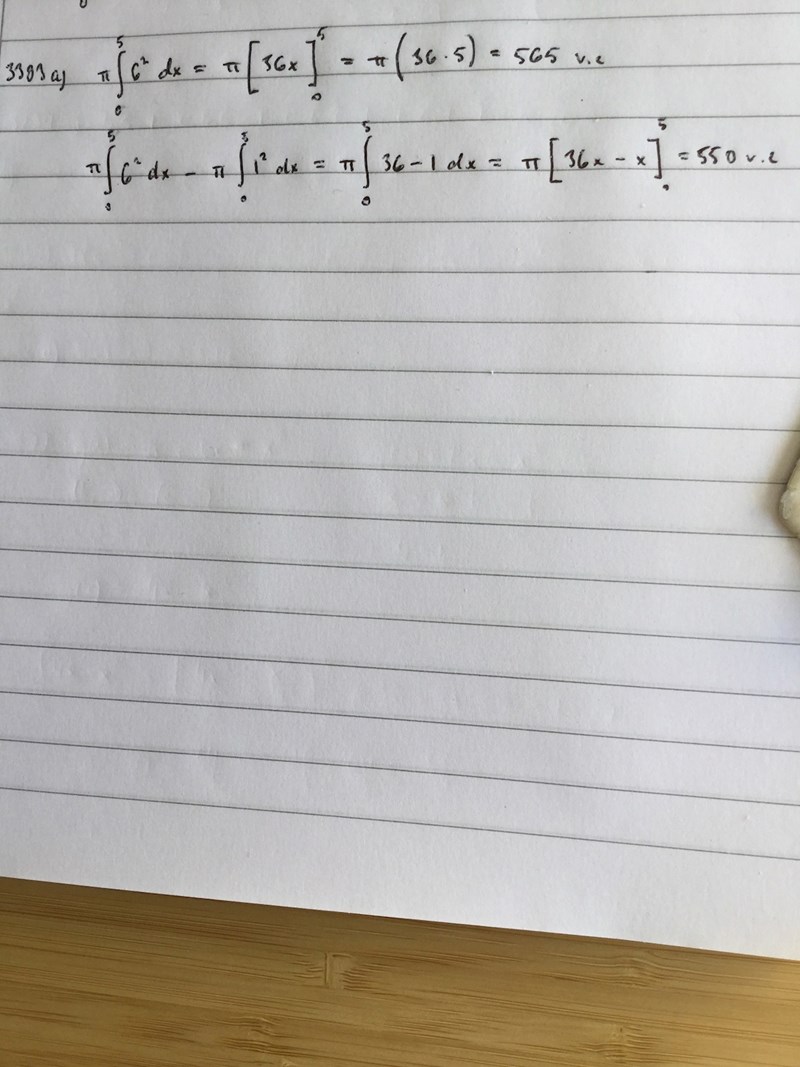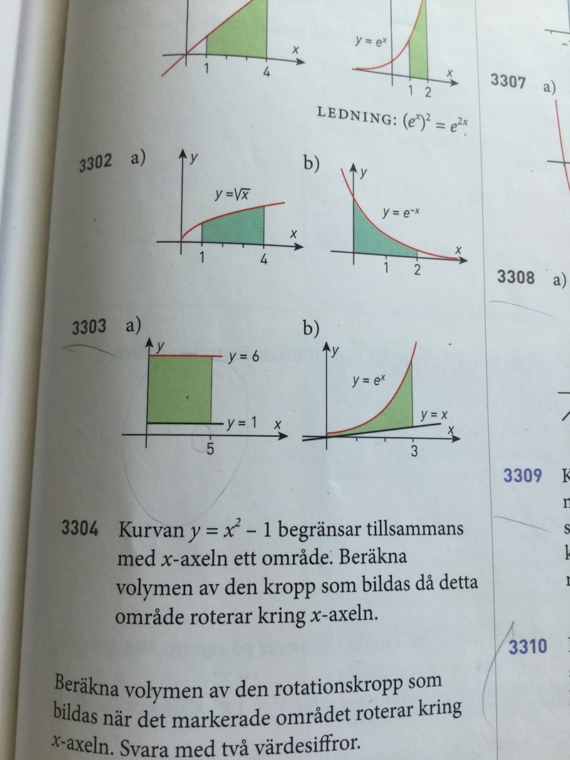 Du har beräknat volymen av kroppen som avgränsas av y=6 och x-axeln. Det du vill beräkna är volymen av kroppen som avgränsas av y=6 och y=1. Vet du vad skillnaden blir?