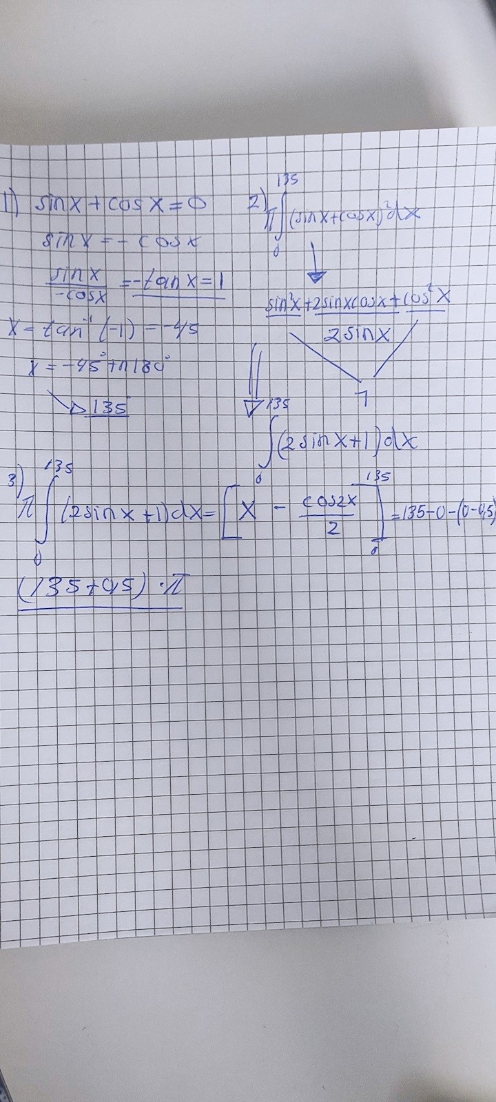 Det område som begränsas av de positiva koordinataxlarna och kurvan y = sinx + cosx får rotera kring x-axeln. Bestäm rotationskroppens volym.