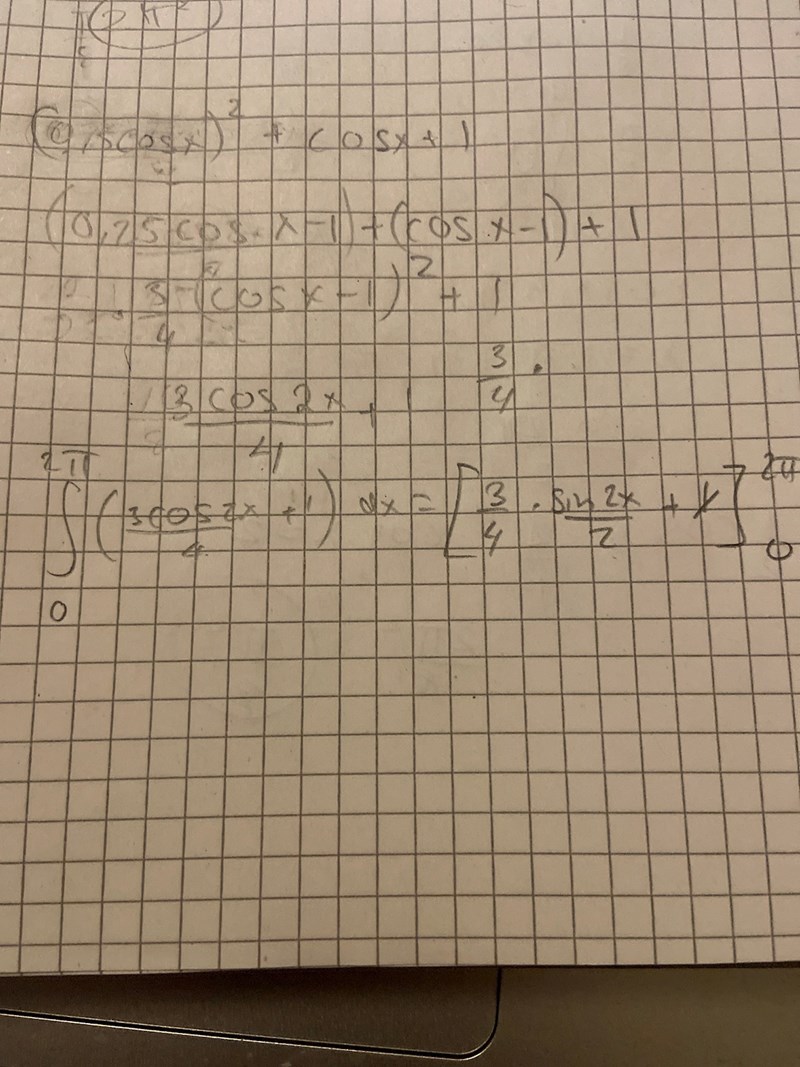Notera att integralen av cos(x) över [0,2π] = 0 så den termen kan du ta bort direkt och konstanterna kan du gruppera till egen integral om du vill.