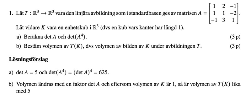 fast ska man på uppgiften ta fram bilderna av vektorerna <1,0,0>, <0,1,0> och <0,0,1> och sedan räkna ut volymen av den parallelepiped som bilderna spänner upp? det var så jag tolkade uppgiften och fick svaret till detA men är osäker på huruvida det är det som uppgiften vill