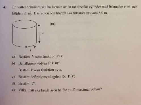 i E) du kan använda använda dig av formeln för cylinders volym sedan substituera h med 8-r eller omvänt. Sedan antar jag du redan kan räkna utt en funktions maximum punkt.