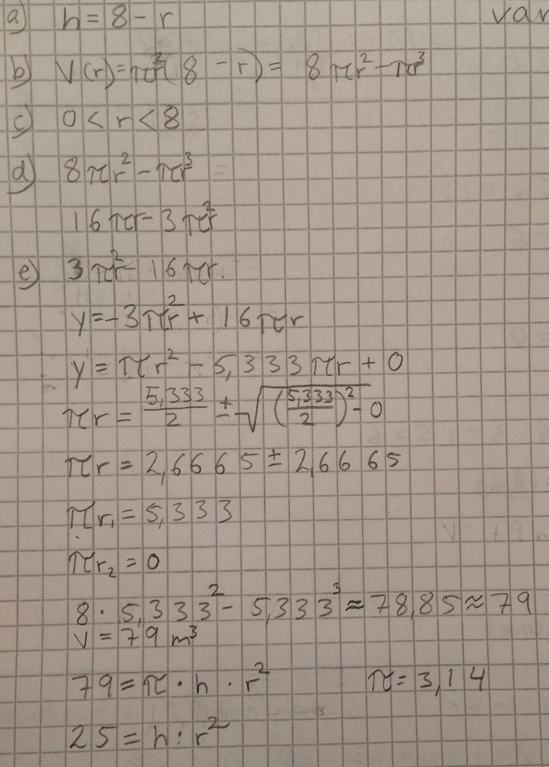 Substituera h med (8-r) då v(x)=8*pi*(r^2)-(r^3)*pi derivera 16*pi*r-3*pi*(r^2)