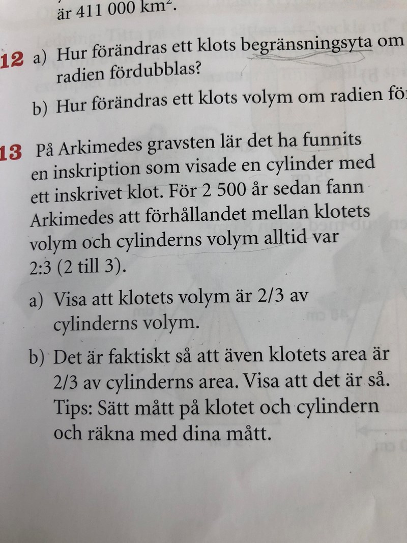 Om man känner till att klotets volym är 4*pi*r^2 , cylinders volym är ju pi*2r*r^2 man ska bara ta 2/3 * cylindervolym på sätt kan man bevisa. Men min fråga är varför höjden i en cylinder kan skrivas om som 2r?