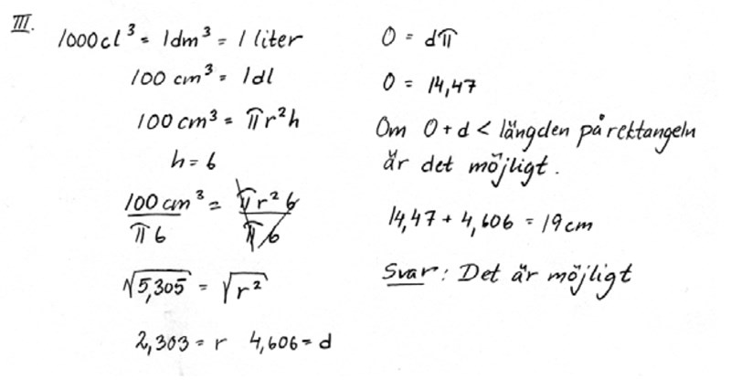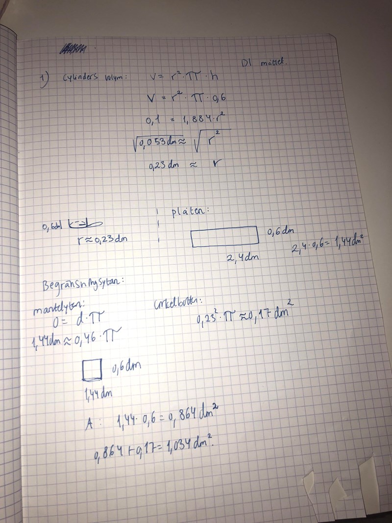 3. 100=πr2·6100=\pi r^2\cdot 6, dvs r2.3r\approx 2.3 cm. Det betyder att bottenytans diameter d4.6d\approx 4.6 cm. Plåtbitens bredd är 66 cm, vilket betyder att det går att klippa ut en cirkel med den diametern ur plåtbiten.