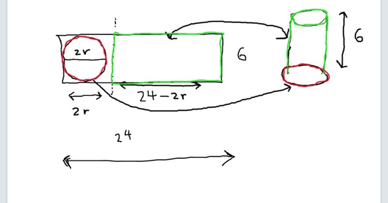 Det material som går åt är dels en bit i botten, 6x6 cm som man klipper till en cirkel, dels mantelytan. Återstår (24-6)x6 cm plåt. av det kan du göra en cylinder som är 18 cm hög och har omkretsen 6 cm