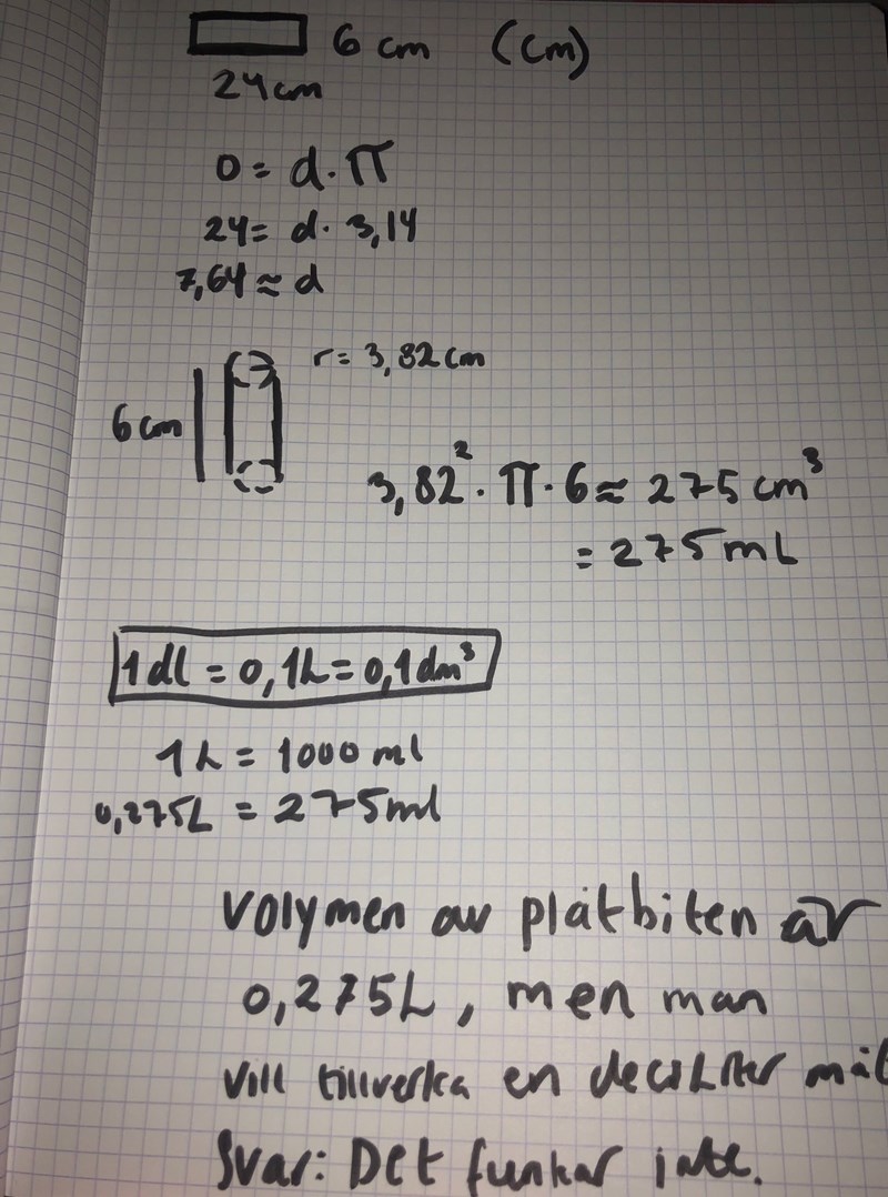 Min slutsats -> Plåtbitens volym blir större än 1dl måttet. Man måste minska/klippa lite från plåten så att den ska bli mindre. Plåtbitens volym ifall man rullar den till en cylinder är 0,275L=0,275dm^3