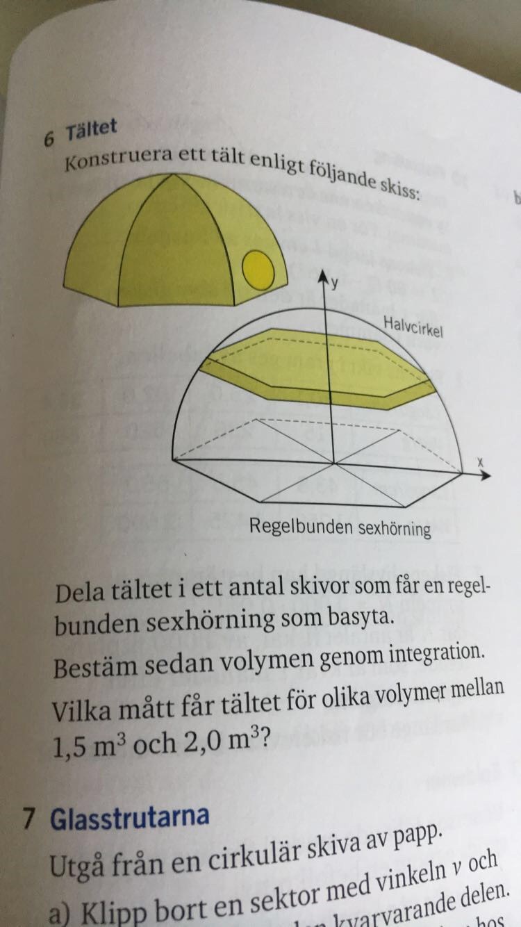 Om du läser igenom uppgiften ordentligt, kan du hitta ett samband mellan r och h, och sedan kan du ta fram en funktion för tältets area på en viss höjd och sedan integrera för att få fram hela tältets volym.