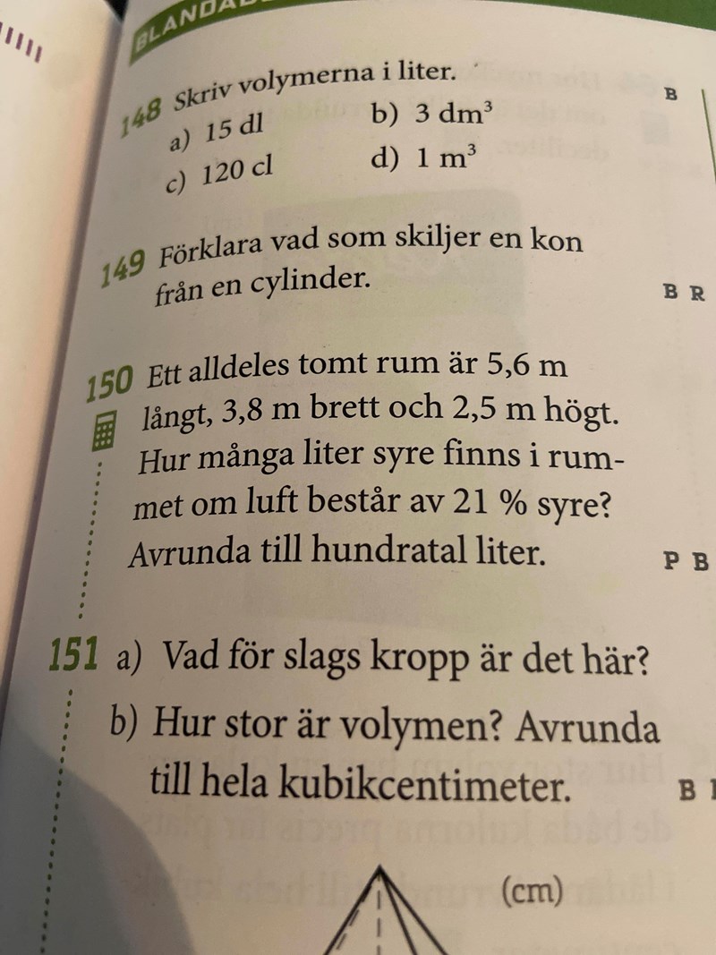 - Räkna ut rummets volym i kubikdecimeter (tips volymen av ett rätblock är längd gånger bfedd gånger höjd). Visa hur du gör det.