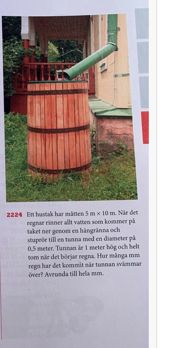 När jag skulle göra denna uppgift så förstod jag inte riktigt hur takets area har o göra med bunkens volym . Jag fattade inte riktigt alls hur jag skulle lösa uppgiften. När jag testa så blev det bara helt fel, jag räknade ut volymen på bunken och det täntke jag borde vara svaret. Men svaret är 4mm, någon som kan förklara?