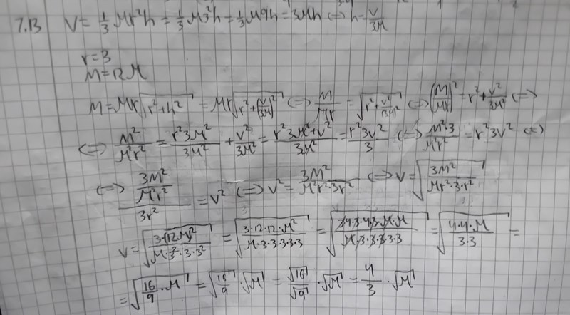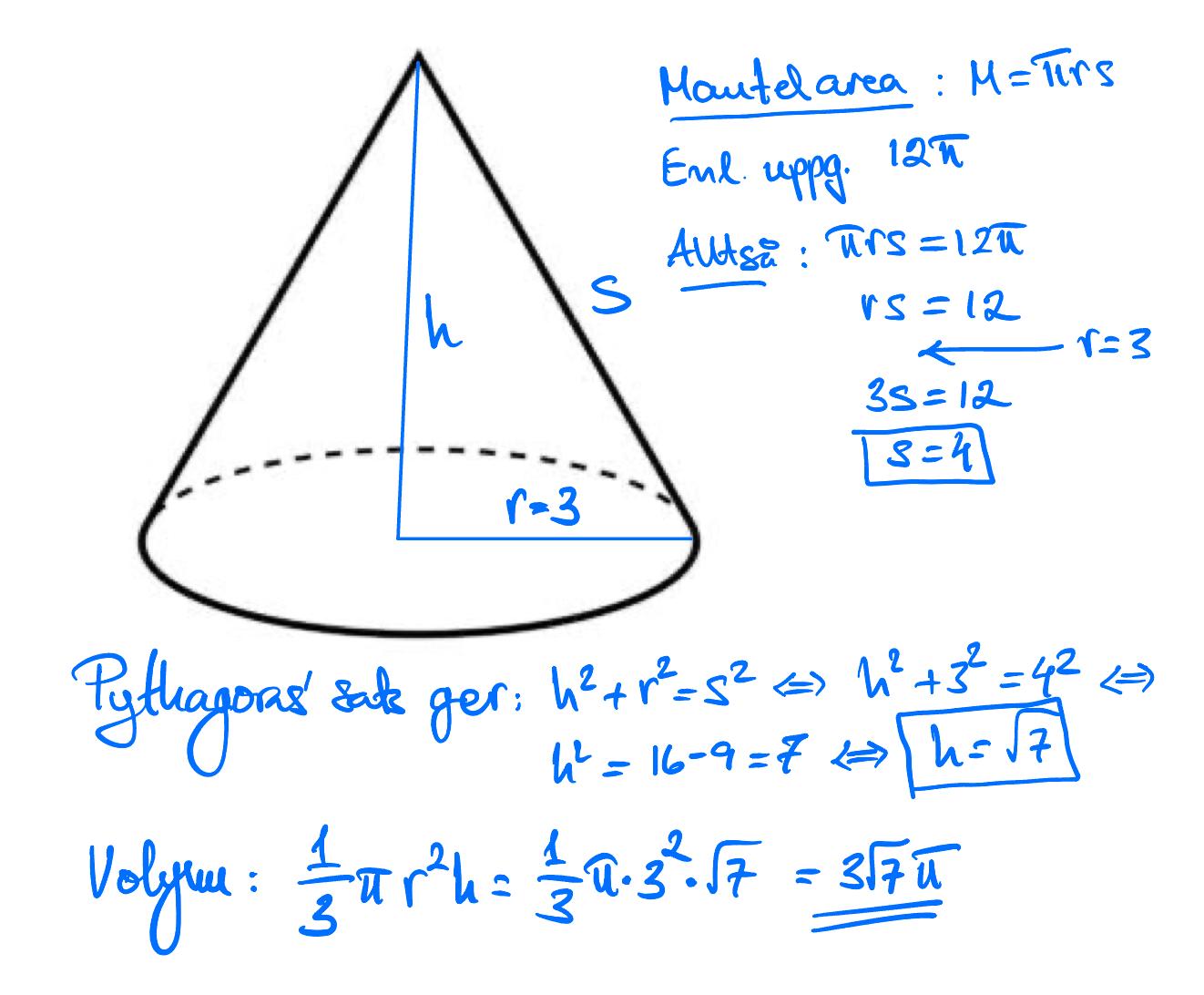 Frågan lyder: Beräkna volymen av en kon med basradien 3 och mantelarean 12pi