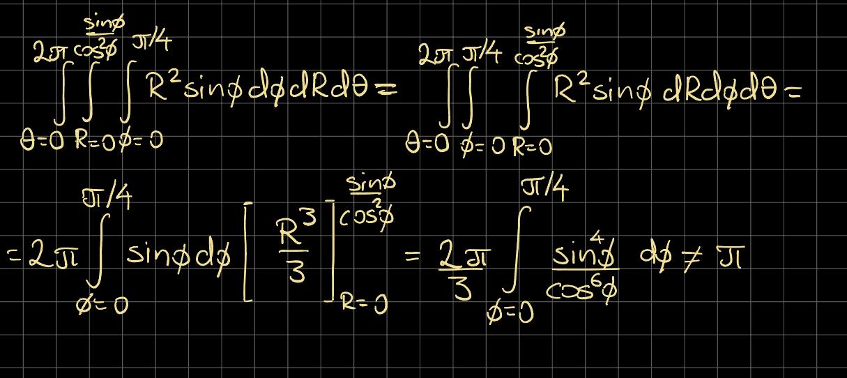 Vill beräkna volymen inuti och mha sfäriska koordinater. Tror att jag möjligtvis gör fel när jag beräknar R.