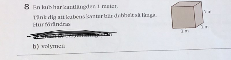 Om du ökar kantlängden så den blir dubbelt så lång, hur stor blir då kantlängden? Hur stor blir volymen?