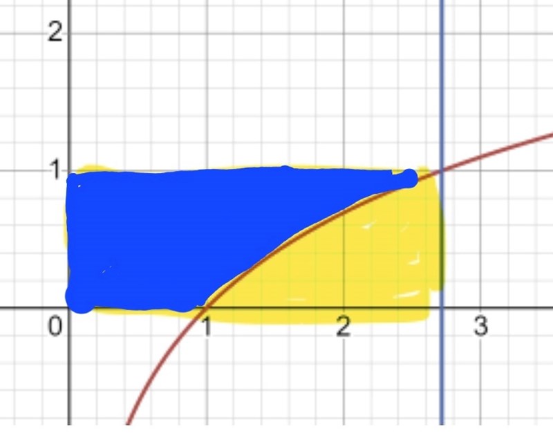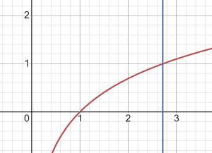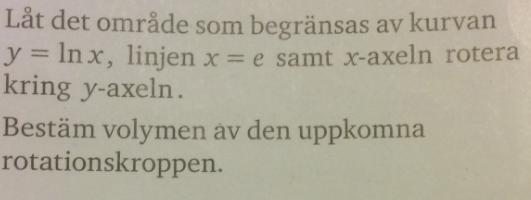 Den rotationskropp du vill volymberäkna är den som uppstår då det gula området under logaritmkurvan roterar ett varv runt y-axeln.