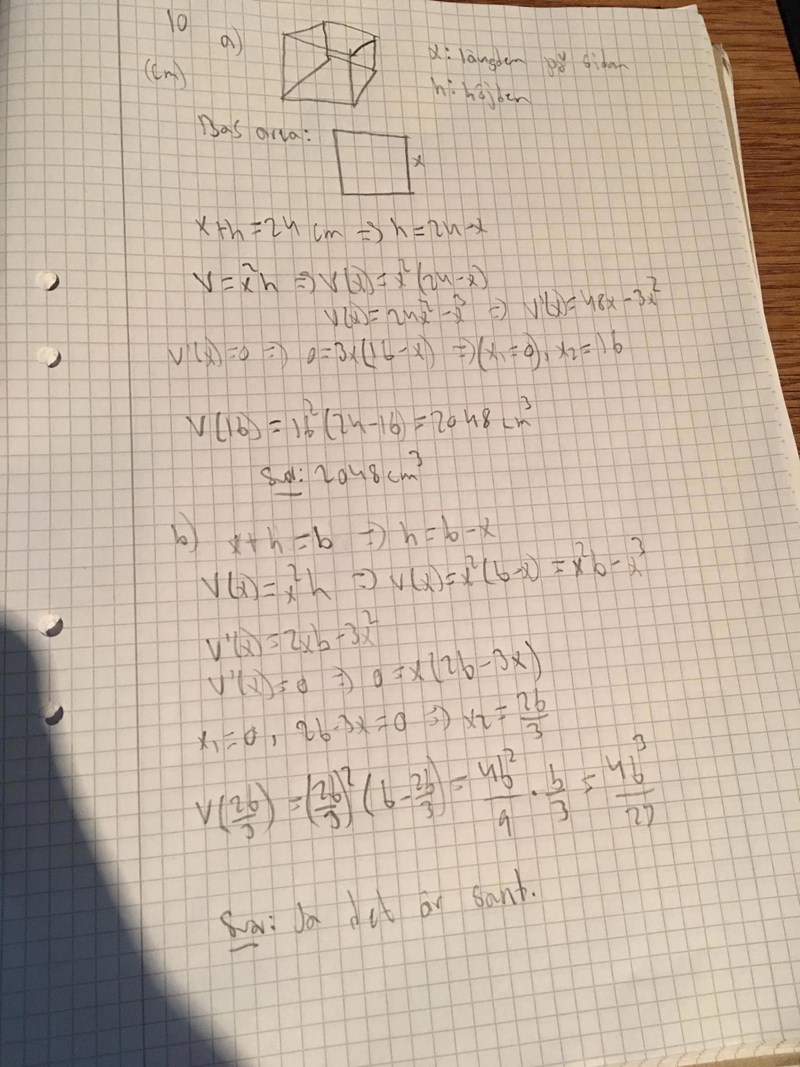 b) Om summan av en sida i bottenytan och lådans höjd är b så blir uttrycket för den maximala volymen . Är det sant?