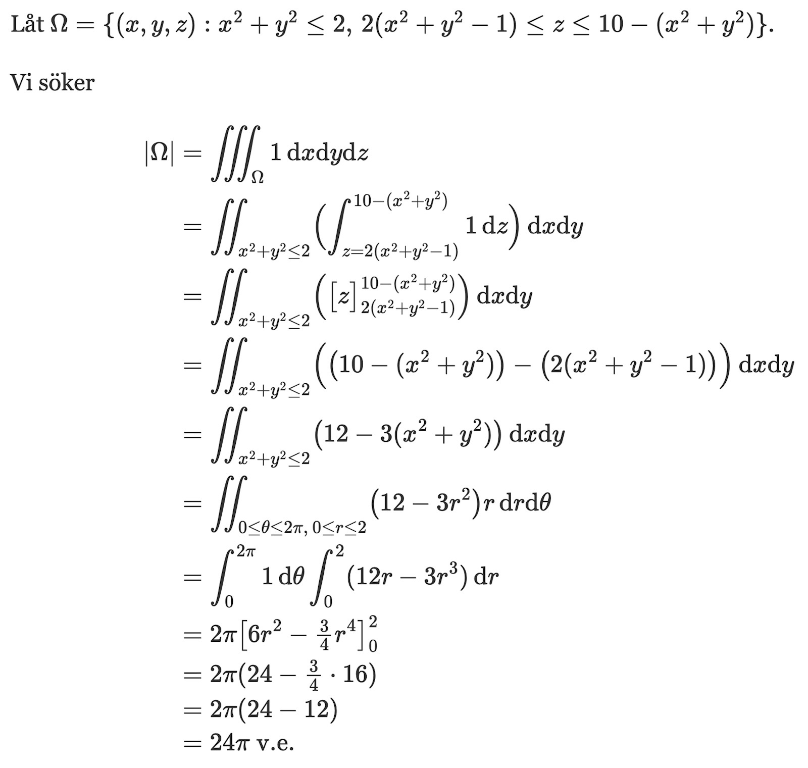 Försöker räkna ut volymen mellan z=10-x^2-y^2 och z=2(x^2+y^2-1). Försöker få fram de polära gränsvärdena. De jag fått fram är (< är oxå lika med, fanns inget kortkommando för de) 0<R<2. De andra antar jag är 0<θ<2pi och 0<Φ<pi. Svaret ska bli 24pi, men får till (8/3)2pi(1-1/sqrt2).