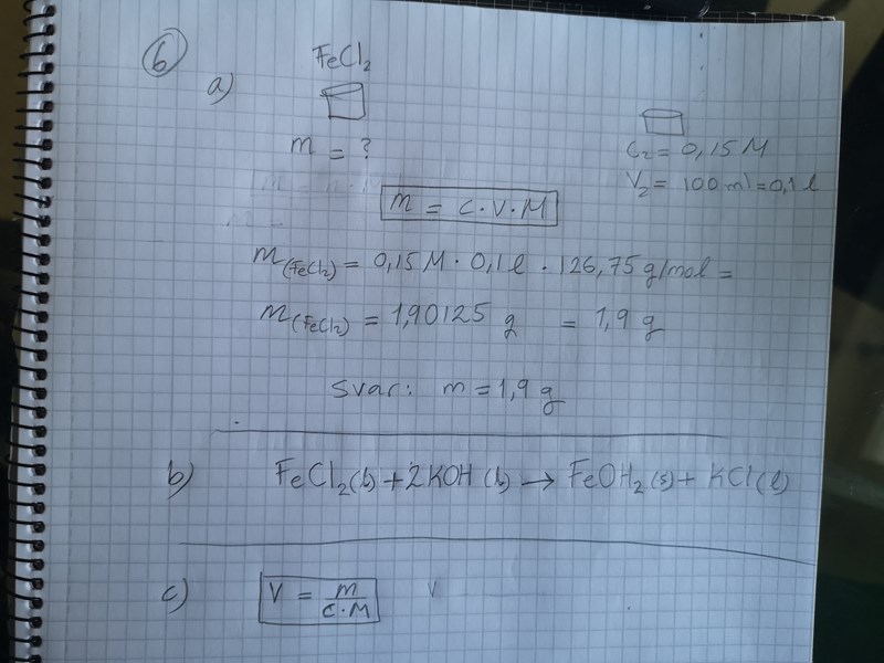 I b) har du skrivit fel aggregationstillstånd för reaktanterna samt kaliumklorid. De är i vattenlösning (aq) och inte flytande (l) som du har skrivit. Dessutom är inte formeln balanserad eftersom du har två kloridjoner i vänsterledet men bara en i högerledet, samt två kaliumjoner i vänsterledet men bara en i högerledet. Sen har du skrivit fel formel för järn(II)hydroxid. Du saknar en parentes.