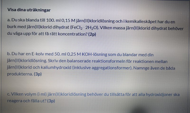 I a) har du missat att räkna med vattnet när du beräknade molmassan för saltet. Du har räknat med molmassan för FeCl2 istället för FeCl2*2H2O. För att ta med vattnet behöver du lägga till två molmassor vatten till saltets molmassa.