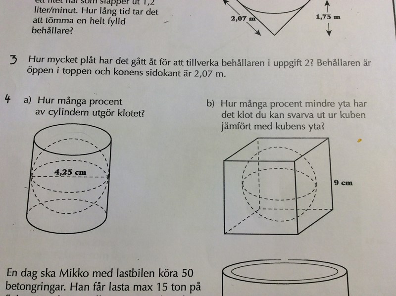 Uppgift 4 a och B skulle jag behöva hjälp med, hur räknar jag. För jag måste väll först räkan ut volymen på klotet och sedan cylindern men jag har inte höjden på cylindern så hur räknar man då? Destsamma gäller uppgift 4b.