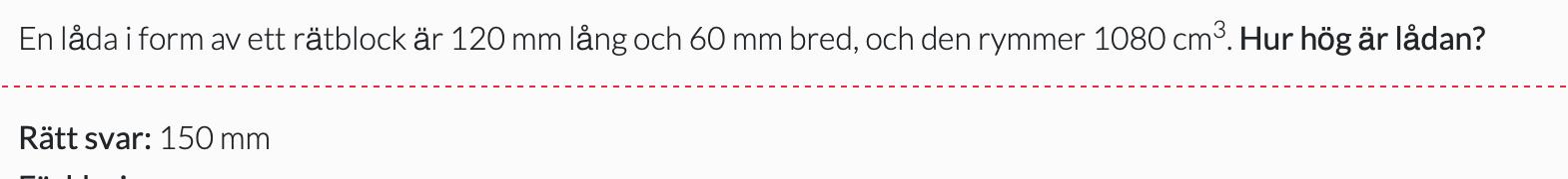Jag svarade 15mm för tänkte att 120 · 60 är 7200mm -> 720 cm^2 och tänker då att man måste multiplicera med 1.5 cm för att få 1080 cm^3. Ser inte helt vart jag gjort fel här?