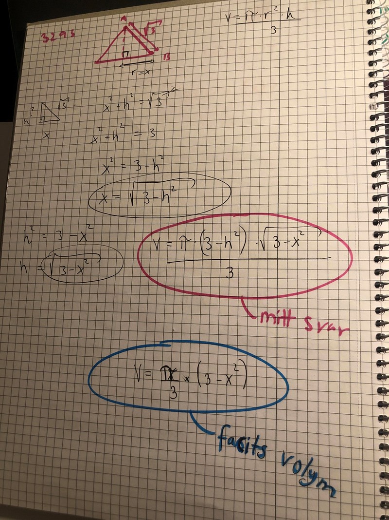 Du har både x och h i ditt svar. Det verkar som om du har fått fram både att och att men du måste bestämma vilken av variablerna du vill byta ut och vilken du vill behålla. Nu har du bytt ut båda, och då har du ju fortfarande kvar två olika variabler. Jag skulle rekommendera att du använder dig av att x2=3-h2 så får du det enklaste uttrycket - du har ju ingen anledning att ta fram ett uttryck för x när x bara förekommer i form av x2.