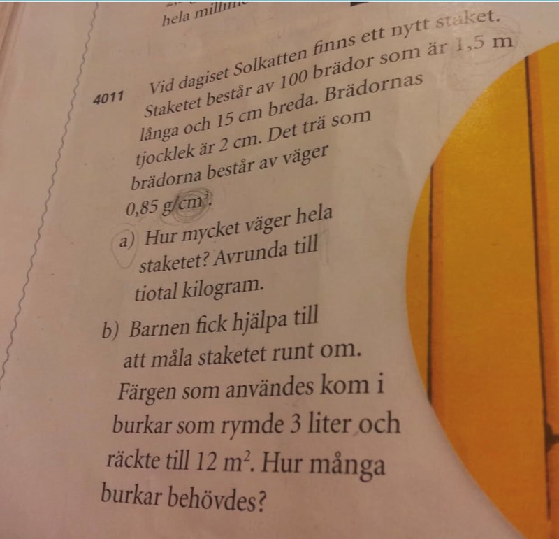 0,0045m^3=4500cm^3 är volymen för ett staket. Det finns 100 st. Så jag tar 4500*100=450000cm^3.