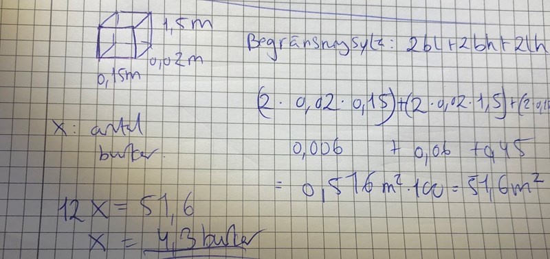 B) Blir fel först eftersom du räknar med volym och inte med area. Om ditt staket vore ihåligt och skulle fyllas med färg hade det varit en rimlig uträkning (men ett väldigt udda problem :D ), men eftersom det är utsidan som ska målas måste du beräkna staketets begränsningsarea, som du gjorde i ditt andra försök.