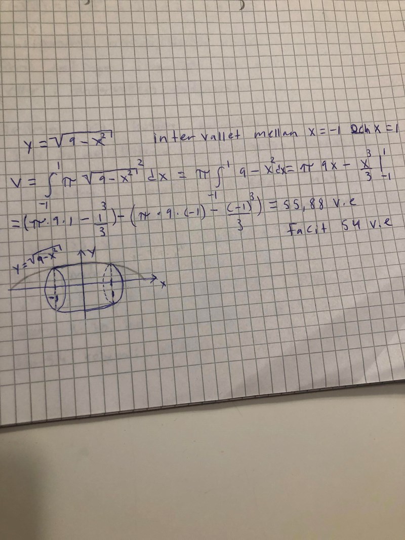 Hej! Har en uppgift där man ska beräkna volymen med hjälp av integraler på en rotationskropp . Har gjort följande: