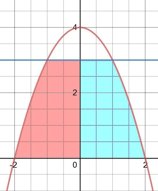 Om vi räknar ut volymen av det vita området och drar bort det från den totala volymen (den du redan räknat fram) får vi volymen av det röda+blå området. Delar vi det med två får vi det blå området kvar.