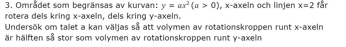 Jag tänker att jag kan beräkna volymen med formeln a∫b πy2 dx