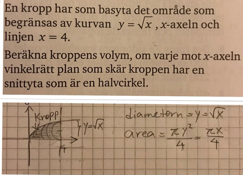 Hej, jag undrar om den frågan som står på bilden. Jag har förståt att det ska vara en halvcirkel som har diametern=y och arean kommer att bli (pi*x)/4. Men i facit står /8. Kan ni vara snälla och hjälpa mig? Har jag tänkt rätt?