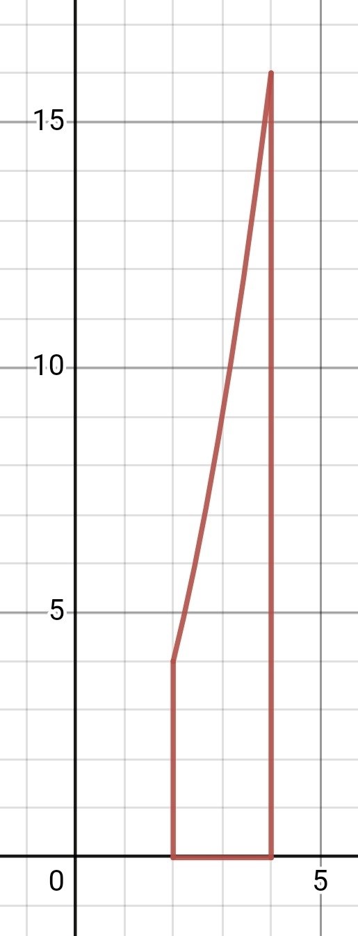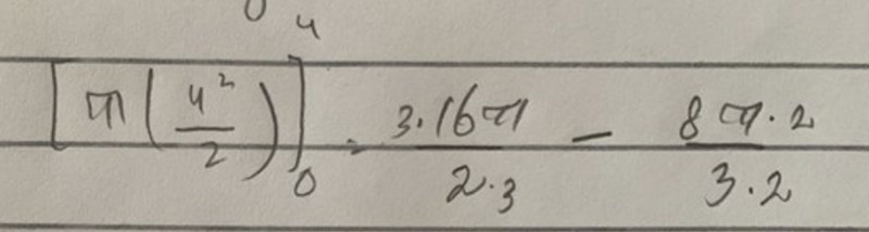 Det jag behöver beräkna är integralen från 0>4 minus - integralen från 2>4 och det ska vara lika med = 16Pi/3, stämmer det?