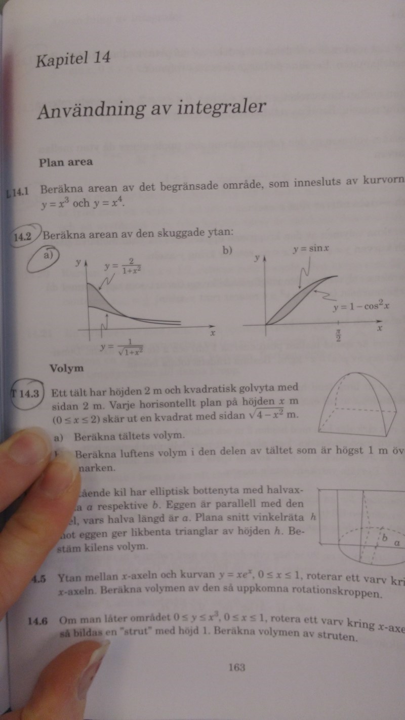 I ledningen står att man ska sätta x-axeln som höjd - så jag tänker mig att man lägger figuren ner längst med x-axeln. För att använda skivformeln ska jag beräkna basarean: roten ur (4-(x^2))^2 = 4-(x^2)