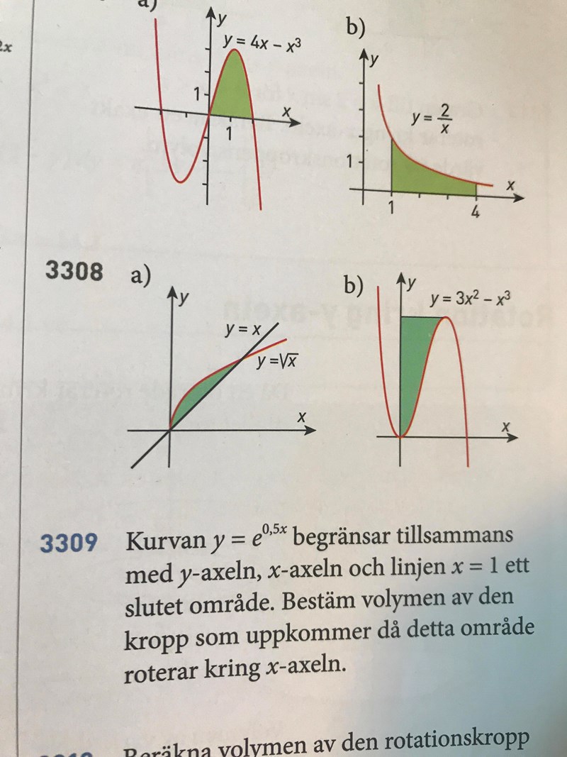 Hej! Jag behöver hjälp med uppgift 3308 i ma4 boken. Hur gör man när man inte vet integrationsgränserna och ska räkna ut volymen med hjälp av integral? Går ju inte att sätta funktionen till noll, eftersom det inte är ett nollställe..tacksam för svar!!