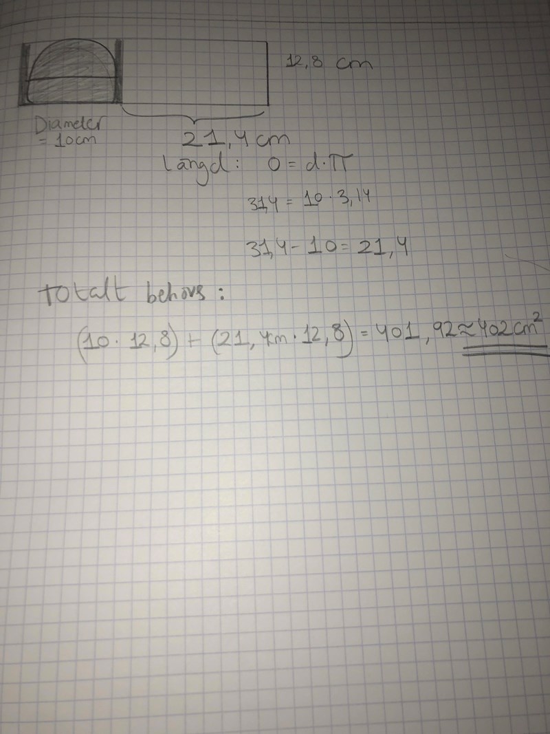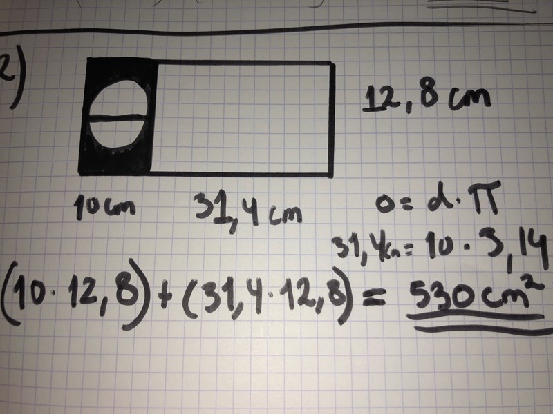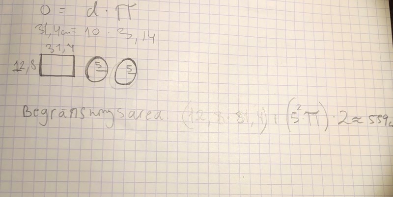 Nytt försök. Det man ska göra är att lägga både cirkeln och rektangeln brevid varandra. Därefter klippa ut en rektangel där båda får plats i... Tänker jag rätt? Vet inte