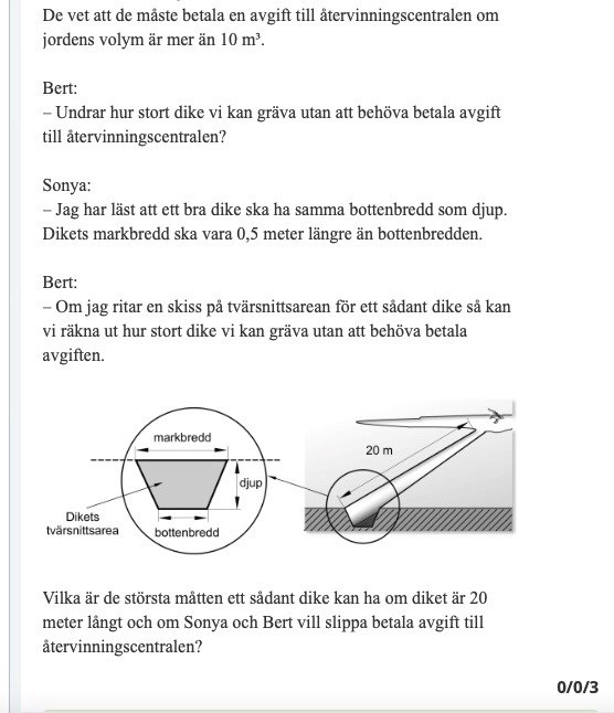 Det står i uppgiften att diket skall vara lika brett i botten som det är djupt, och att det skall vara en halvmeter bredare upptill än i botten. Hur stor är tvärsnittsarean? (Vilken form har fyrhörningen? Hur räknar man ut fyrhörningens area?) Om man räknar i enheten meter blir det lättare i nästa steg.