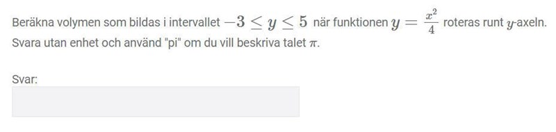 Sätter upp en integral med integrations gränserna -3 och 5 med inte granden 4y dx. Detta får jag till 32pi fast vet inte ifall det stämmer någon som kan kontrollera?